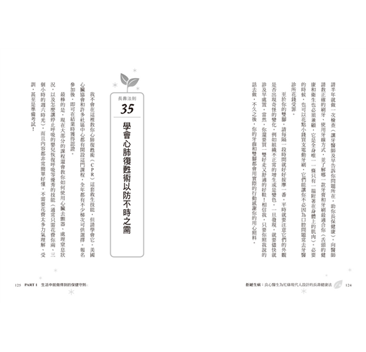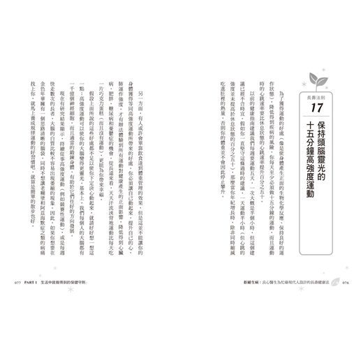 這部分提供一套清晰的脈絡,告訴你在每一天的生活中可以用哪些簡單的方法常保健康,而不需要深入理解一大堆以理論、研究、歷史和科學,堆砌而成的僵化指令。