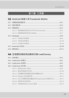 ■ 移動安全篇:本篇偏重介紹很多應用中經常會忽略的安全知識,主要包含混淆、反編譯、金鑰隱藏、強化和如何撰寫安全的程式等基礎知識。