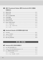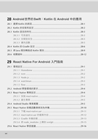 ■ 新技術篇:本篇偏重介紹新近出現的技術點,當然可能本書出版時已經不是最新了,但並不妨礙其重要性,主要包含函數式程式設計思想簡介、依賴植入、Kotlin、React Native、線上熱修復、AOP 和Facebook Buck 等基礎知識。