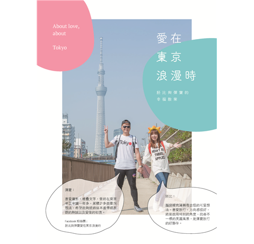 「有些愛情,是可以帶給人們啟發的。」一直抱持著這樣的初衷跟想法,完成了這 一本書,東京對於胚比與彈寶來說,是座充滿愛與期待的城市,多年前在這裡,我 們選擇將彼此曖昧的友情畫上休止符,在鎌倉紫陽花的簇擁下堆疊浪漫,在公園裡 的仙女棒煙花綻放下輕輕牽手,於是東京成了我們愛情長跑的起點,往後一邊對抗 著遠距離大魔王的挑戰,一邊計劃著每次得來不易的幸福相聚。
