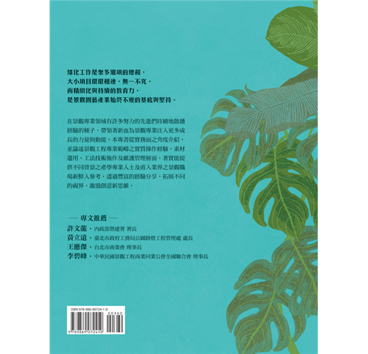 本專書對於景觀與園藝的專業施作細則,以及對城市景觀未來的思索,可提供在學學生、及業者們參考切磋。特邀集景觀園藝產業頂尖人物參與撰寫,從實務面之角度介紹,並論述景觀工程專業範疇之實質操作經驗,素材選用、工法技術施作及維護管理層面,著實能提供不同背景之產學專業人士及甫入業界之景觀職場新鮮人參考,透過豐富的經驗分享,拓展不同的視界,激盪創意新思維。