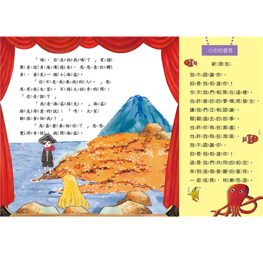 意外的,小美人魚只是淡定的看著海盜,不受驚嚇,讓小海盜感到意外。小美人魚告訴小海盜,她的爸爸更兇,卻是愛護子女的好爸爸,因此認為小海盜並不是壞人。小美人魚的心融化了小海盜,化解了危機,更進一步引導小朋友放下成見,與小海盜做朋友。