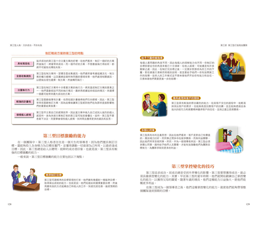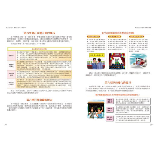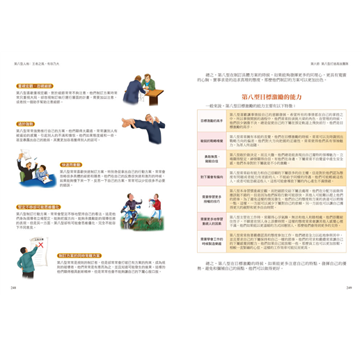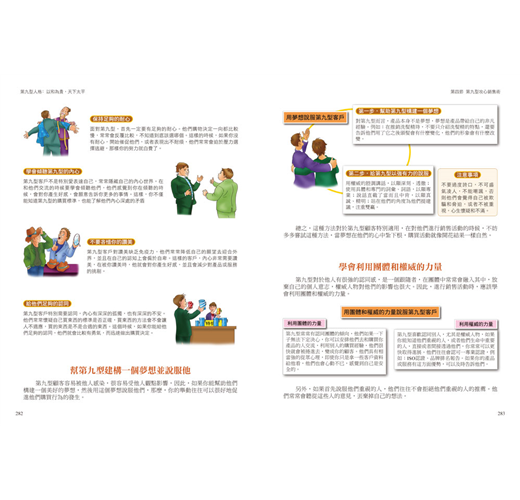 ˙圖文並進:文中穿插圖解、表格、樹狀圖等,讓讀者能更直接明白九型人格的交流。