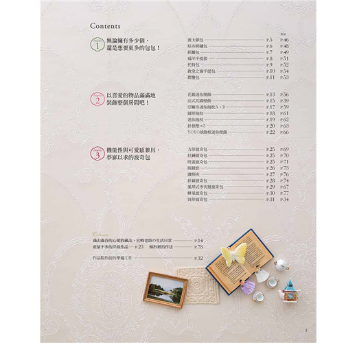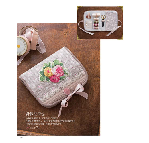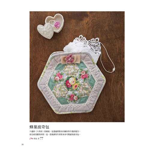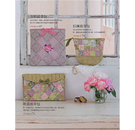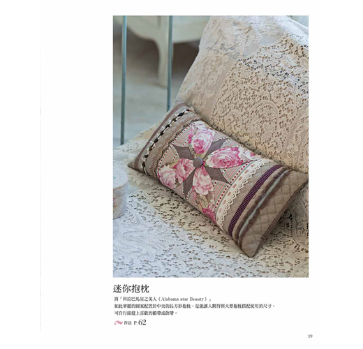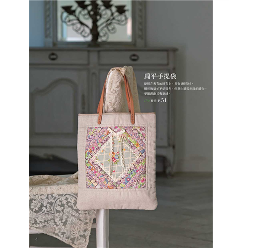 書中介紹作品皆附有詳細作法教學及原寸紙型,宮崎老師也貼心示範了多款圖形的拼接方法,讓初學者也能照著圖解步驟,一步一步地學會縫製技巧,除了最基礎的小塊拼接,較為進階的傳統拼布圖形亦有詳解,十分適合具有程度的中階拼布人挑戰,可將本書教學的圖形加以運用在壁飾作品,不同的圖形組合,會有截然不同的拼布視角喔!準備好工具,快與宮崎順子老師一起徜徉在可愛又甜美的法式花海裡吧!