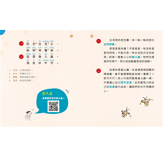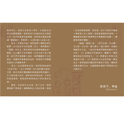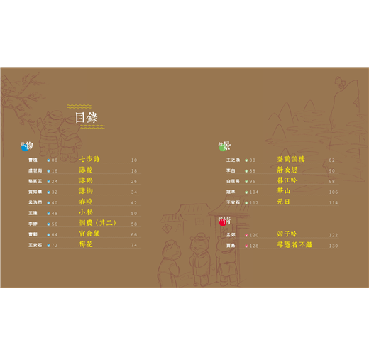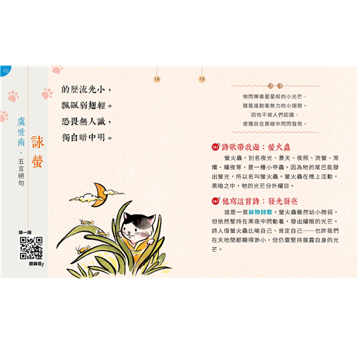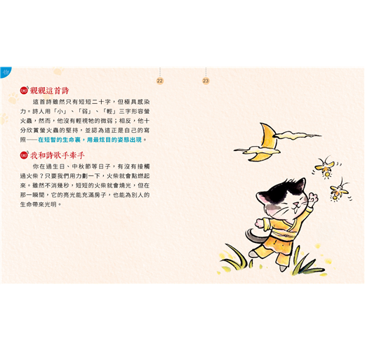 活學:每篇含作者簡介、原文、注釋、拼音、成詩背景、重點題旨、並以學童能夠掌握的故事性語言作賞析及舉出生活化例子,配以可愛的古裝貓插圖,拉近古詩與孩子的距離。