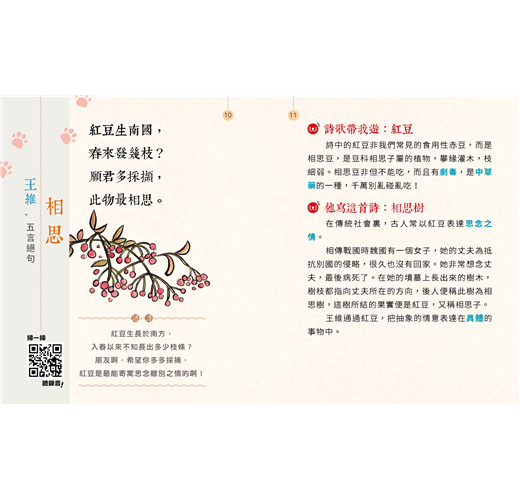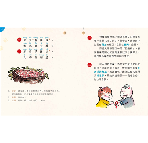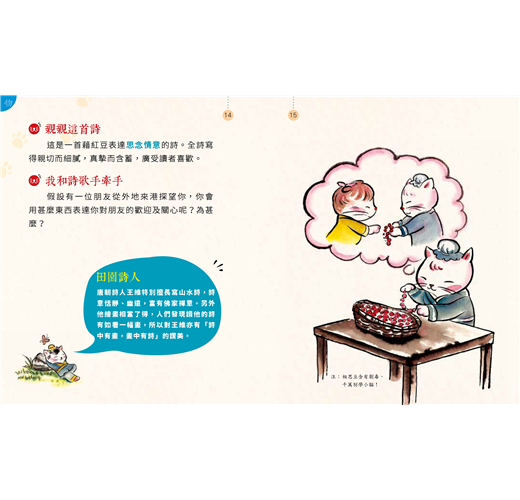 活學:每篇含作者簡介、原文、注釋、拼音、成詩背景、重點題旨、並以學童能夠掌握的故事性語言作賞析及舉出生活化例子,配以可愛的古裝貓插圖,拉近古詩與孩子的距離。