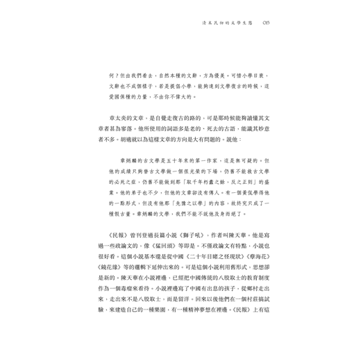 章炳麟的古文學是五十年來的第一作家,這是無可疑的。但他的成績只夠替古文學做一個很光榮的下場,仍舊不能救古文學的必死之症,仍舊不能做到那「取千年朽蠹之餘,反之正則」的盛業。他的弟子也不少,但他的文章卻沒有傳人。有一個黃侃學得他的一點形式,但沒有他那「先豫之以學」的內容,故終究只成了一種假古董。章炳麟的文學,我們不能不說他及身而絕了。