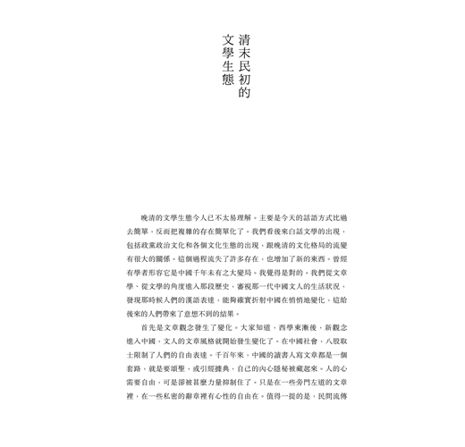 晚清的文學生態今人已不太易理解。主要是今天的話語方式比過去簡單,反而把複雜的存在簡單化了。我們看後來白話文學的出現,包括政黨政治文化和各個文化生態的出現,跟晚清的文化格局的流變有很大的關係。這個過程流失了許多存在,也增加了新的東西。曾經有學者形容它是中國千年未有之大變局。我覺得是對的。我們從文章學、從文學的角度進入那段歷史,審視那一代中國文人的生活狀況,發現那時候人們的漢語表達,能夠確實折射中國在悄悄地變化,這給後來的人們帶來了意想不到的結果。