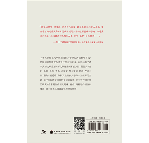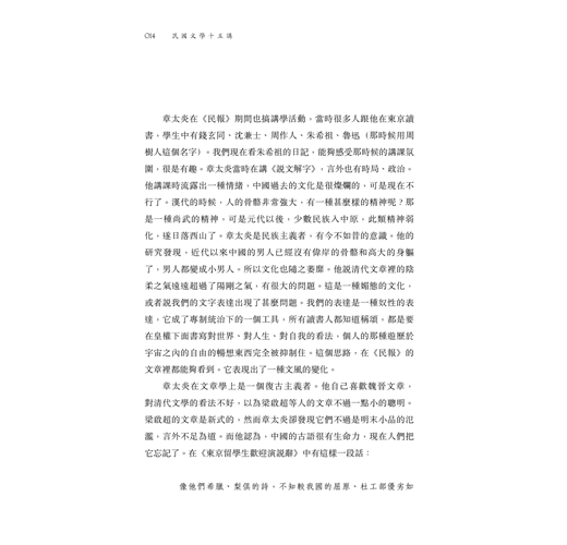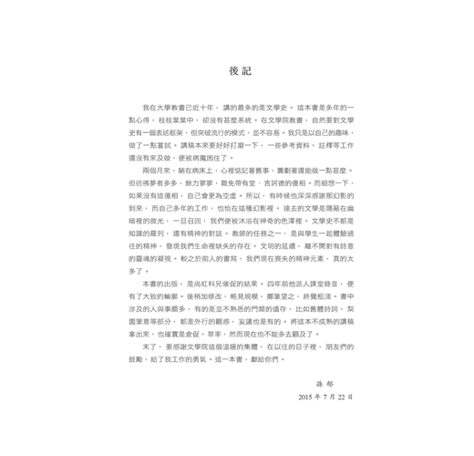 我在大學教書已近十年,講的最多的是文學史。這本書是多年的一點心得,枝枝葉葉中,卻沒有甚麼系統。在文學院教書,自然要對文學史有一個表述框架,但突破流行的模式,並不容易。我只是以自己的趣味,做了一點嘗試。講稿本來要好好打磨一下,一些參考資料、註釋等工作還沒有來及做,便被病魔困住了。