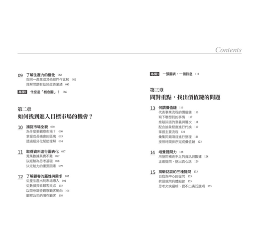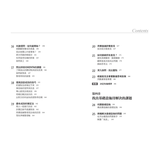 如何描繪公司價值鏈圖表,以及學會「絕不搞砸」的訪談技巧,挖出員工和顧客的真心話,並將蒐集到的意見,整理成足以掌握「事實」的表格,避免頭痛醫頭腳痛醫腳的陷阱。