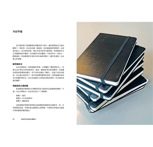 在正式開始前,我們建議你準備一本專屬的「聯想筆記本」。你將以這本筆記本來收集想法、概念、觀察結果及新的聯想。它能讓你張貼富啟發性的圖片、寫下你的反應及「啊哈」、記錄下進步的跡象,而且還方便你寫下一章中的挑戰與練習的答案。我們建議你使用空白無線的筆記本,而且頁面最好大到便於素描或書寫,但又袖珍到便於攜帶。