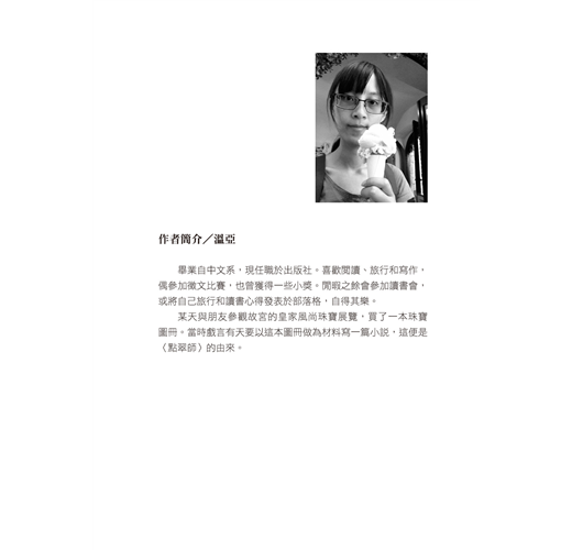 畢業自中文系,現任職於出版社。喜歡閱讀、旅行和寫作,偶參加徵文比賽,也曾獲得一些小獎。閒暇之餘會參加讀書會,或將自己旅行和讀書心得發表於部落格,自得其樂。