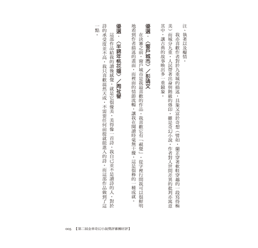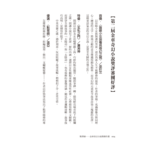 奇幻文學作品可以奔馳在浩瀚宇宙、穿越時空,讓作者發揮天馬行空的想像力,在這個獎項中,奇幻風潮因眾多優秀作品而激盪出不一樣的火花。在未來,我們期許讓這股奇幻的河流,陸續地匯入各屆傑出作者的想法,提供讀者徜徉在這片時而寧靜、時而洶湧的奇幻海洋。