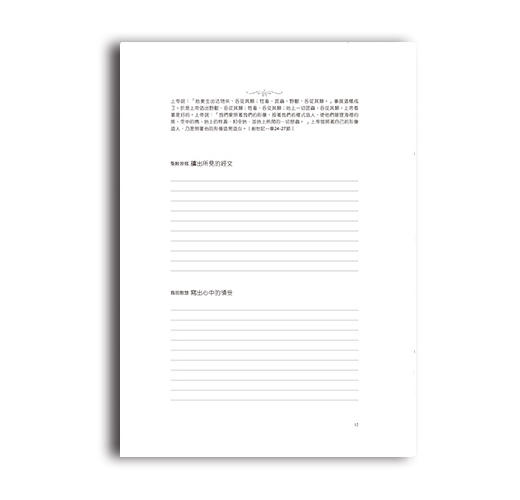 本書是由知名畫家與作者聯手打造的聖經舊約靈修繪本,共44幅聖經故事著色圖;加上靈修經文、靈修書寫、聖經信息,連貫成一卷專屬於您個人的書。