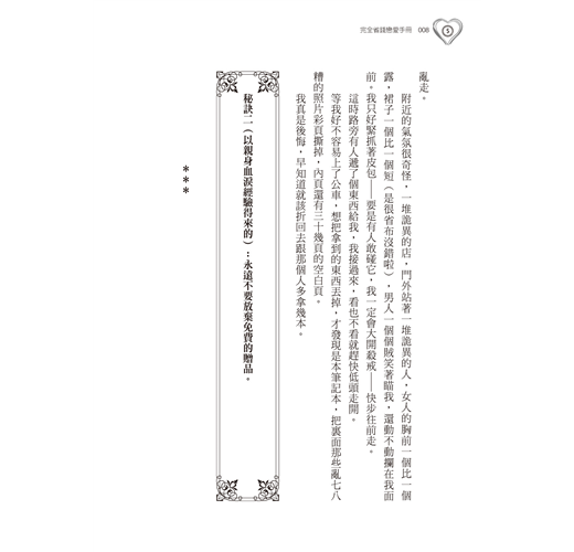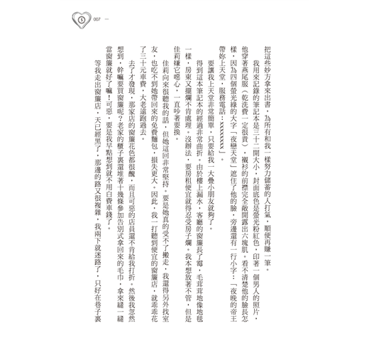 我用來記錄的筆記本是三十二開大小,封面底色是螢光粉紅色,印著一個男人的照片,他穿著燕尾服(乾洗費一定很貴),襯衫的前襟完全敞開露出六塊肌。看不清楚他的臉長怎樣,因為四個螢光綠的大字「夜戀天堂」遮住了他的臉,旁邊還有一行小字:「夜晚的帝王帶妳上天堂,服務電話:xxxxxxxx」。