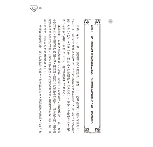 [秘訣一:每天詳細紀錄自己的花費和存款,還要計算距離目標多少錢,來激勵自己。]