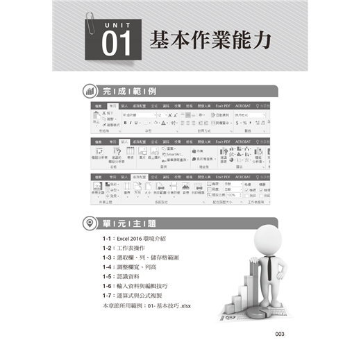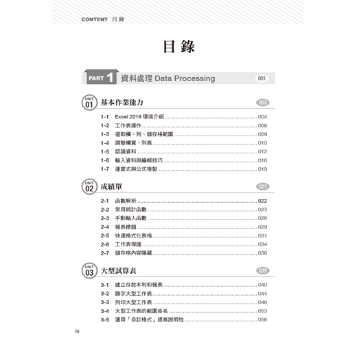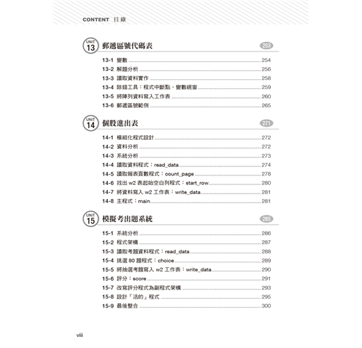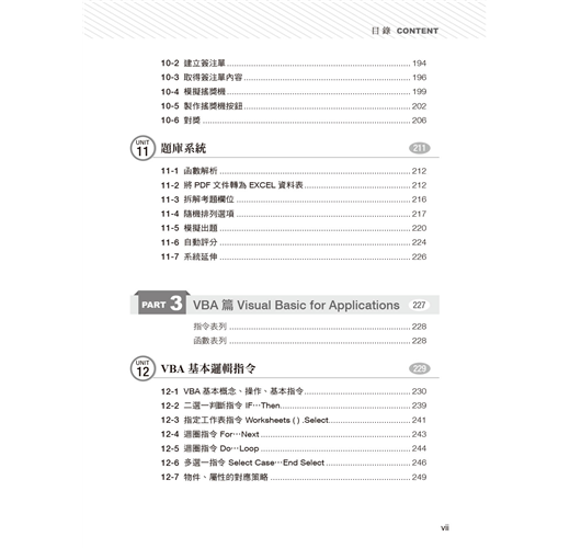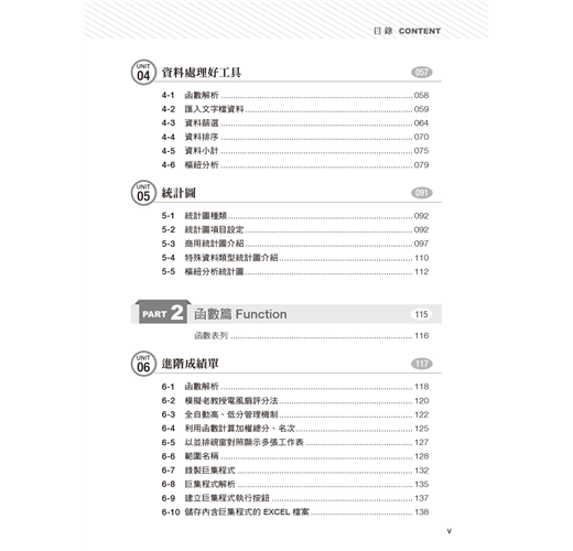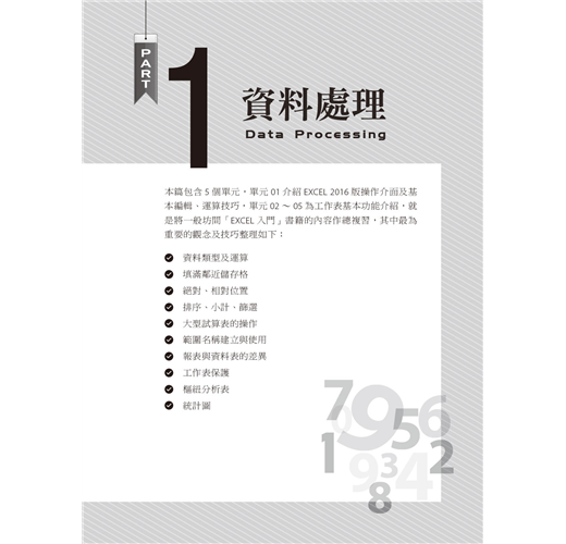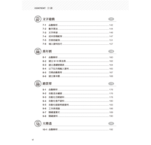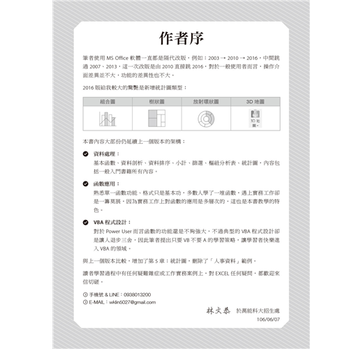 本書的另一特色就是範例導向,每一單元的主體不是「功能」,每一範例的「流程解析」才是主角,實務工作是多元的絕對不是各個單一功能、函數所能解決的,一般讀者也大多陷入「滿天是金條,要抓沒半條」的學習障礙,其實Excel只是個工具,培養問題的解析的能力才能讓Excel的應用出神入化。