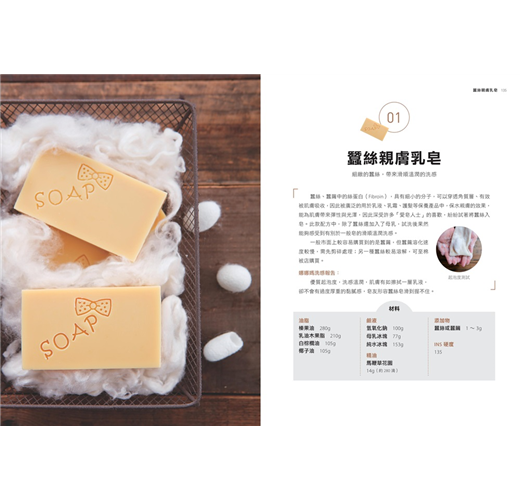 蠶絲、蠶繭中的絲蛋白(Fibroin),具有細小的分子,可以穿透角質層、有效被肌膚吸收,因此被廣泛的用於乳液、乳霜、護髮等保養產品中,保水親膚的效果,能為肌膚帶來彈性與光澤,因此深受許多「愛皂人士」的喜歡,紛紛試著將蠶絲入皂。此款配方中,除了蠶絲還加入了母乳,試洗後果然能夠感受到有別於一般皂的滑順溫潤洗感。