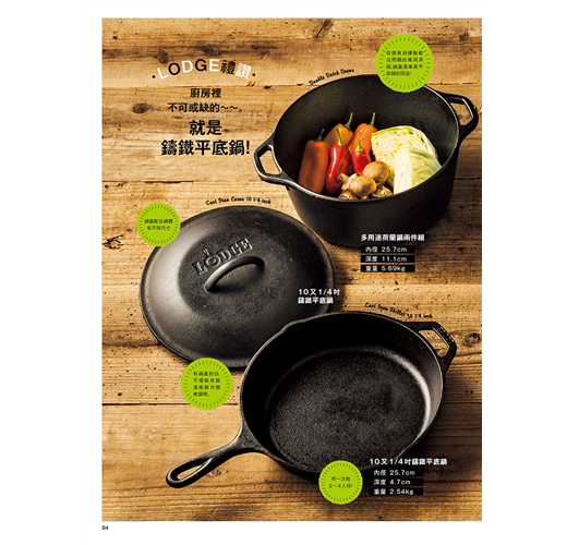 本書是由日本COOKPAD知名料理研究家岸田夕子精心設計,全方位採用 LODGE 的各種鍋型,包括鑄鍋平底鍋、湯鍋、煎鍋或荷蘭鍋等等鑄鐵鍋具,婦女或煮夫在廚房使用起來相當的方便。而且在台灣的經銷點,以及好市多也很容易買到。