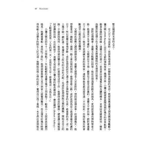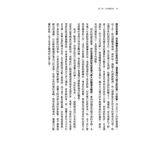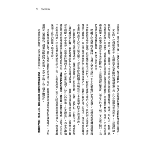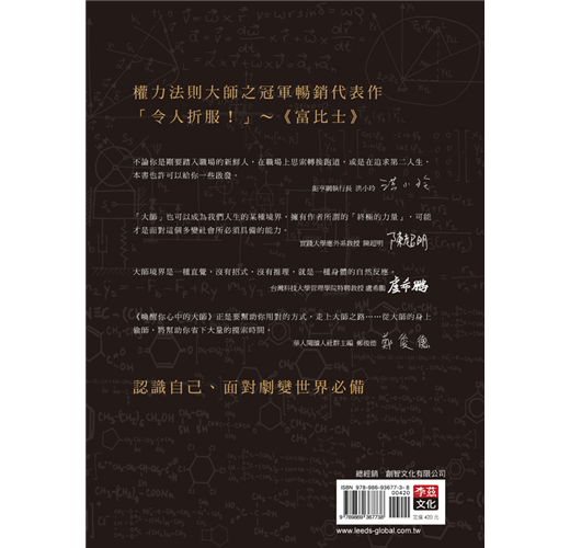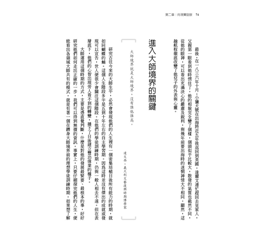 什麼是大師?我不是天生資質優異,可能成為大師嗎?可能成為具有宏觀視野、堅強毅力與深度思考能力的人嗎?作者並沒有要我們成為書中所介紹的大師,然而透過不同階段的磨練、有效策略的心境演化,克服恐懼、戰勝自我的侷限、發展自我心性與思考能力,我們都可以達到大師境界。