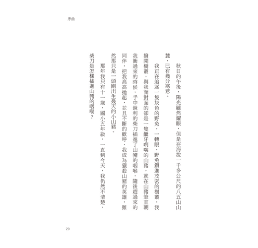 那年我只有十一歲,國小五年級,一直到今天,我仍然不清楚,柴刀是怎樣插進山豬的咽喉?