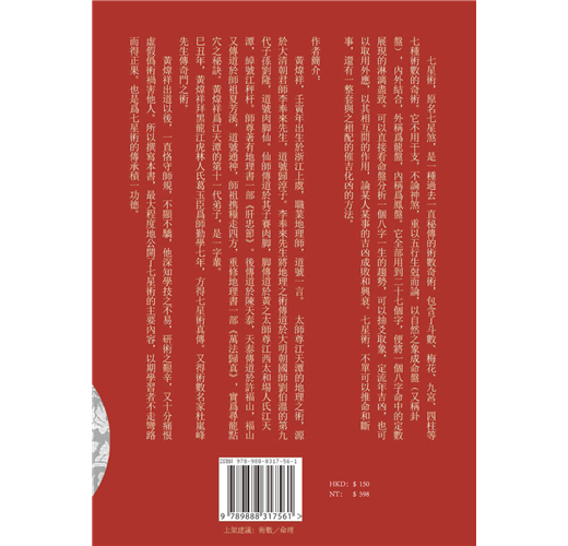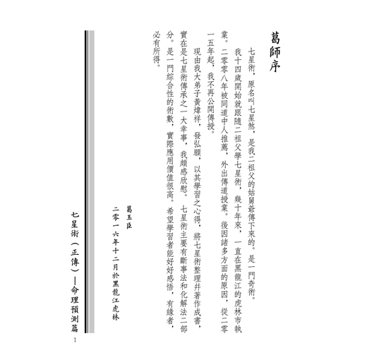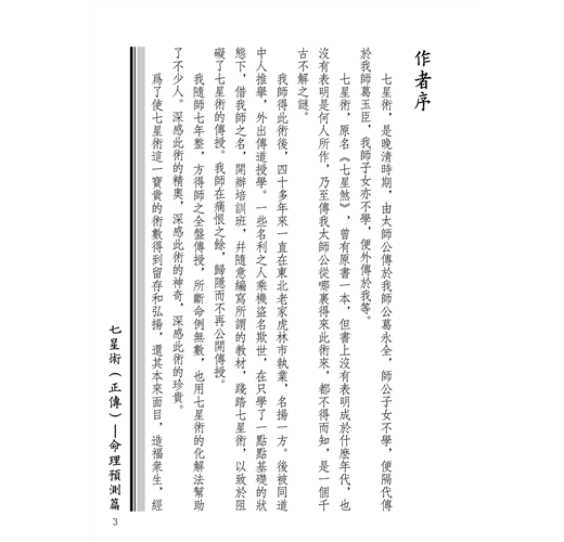 黃煒祥出道以後,一直恪守師規,不顯不驕,他深知學技之不易,研術之艱辛,又十分痛恨虛假僞術禍害他人。所以撰寫本書,最大程度地公開了七星術的主要內容,以期學習者不走彎路而得正果。也是爲七星術的傳承積一功德。