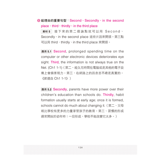 應用5.2:Secondly, parents have more power over their children’s education than schools do. Thirdly, habit formation usually starts at early age; once it is formed, schools cannot do much about changing it. (第二,父母親比學校有更多的力量掌管孩子的教育。第三,習慣的形成通常開始於幼年時;一旦形成,學校不能改變它太多。)