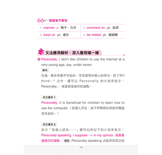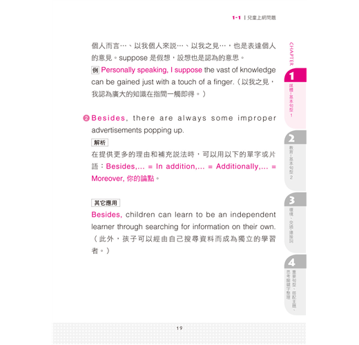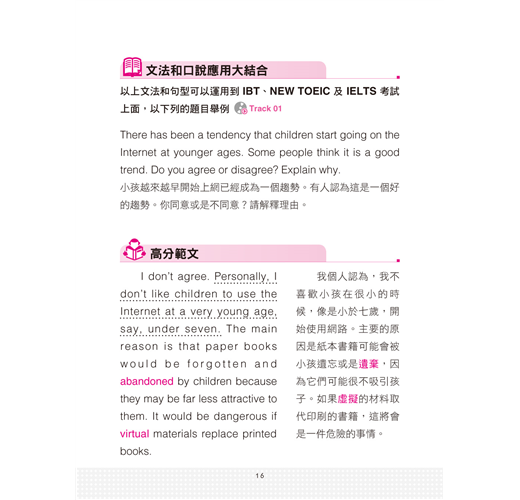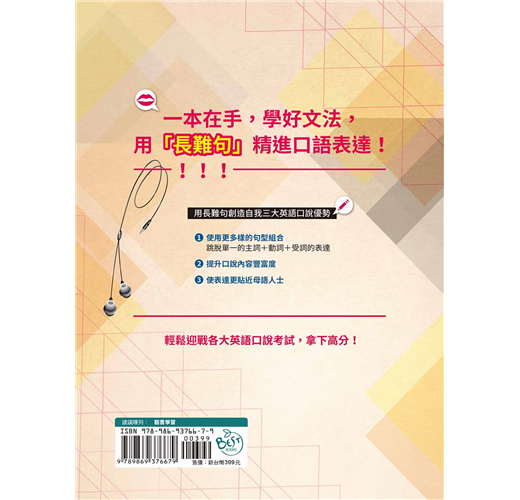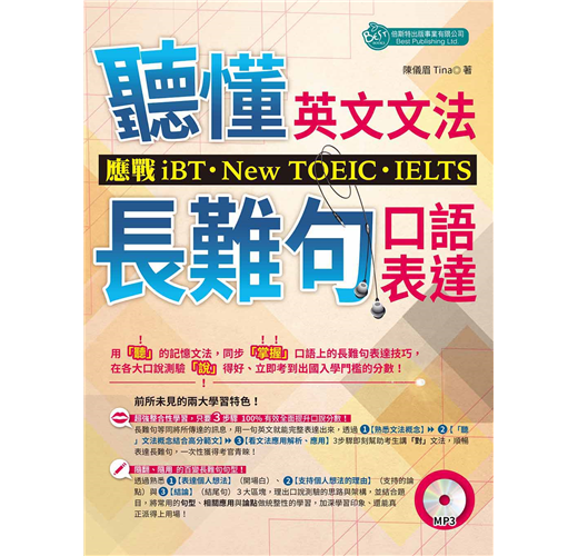 口說一向是亞洲學習者最弱的一環,留學考試對我們這些平常缺乏口語練習的人更是特別棘手。因此擁有此書,絕對是掌握了必勝的工具。本書廣收題材,在八章六個單元之中,共選了48個重點主題,同時示範了正反論點,並結合於文法學習及藉由套用句型,使讀者到達應用文法句型之學習層次。