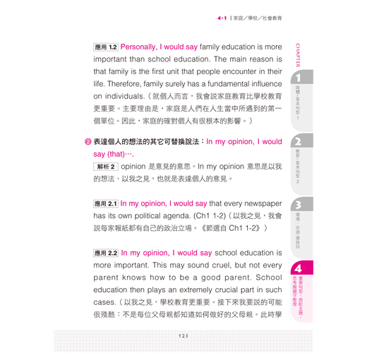 應用1.2:Personally, I would say family education is more important than school education. The main reason is that family is the first unit that people encounter in their life. Therefore, family surely has a fundamental influence on individuals. (就個人而言, 我會說家庭教育比學校教育更重要。主要理由是,家庭是人們在人生當中所遇到的第一個單位。因此,家庭的確對個人有很根本的影響。)