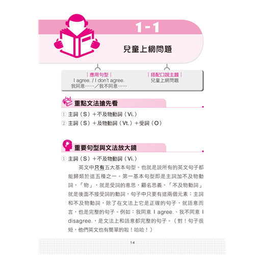 英文中只有五大基本句型。也就是說所有的英文句子都能歸類於這五種之一。第一基本句型即是主詞加不及物動詞,「物」,就是受詞的意思,顧名思義,「不及物動詞」就是後面不接受詞的動詞,句子中只要...