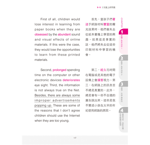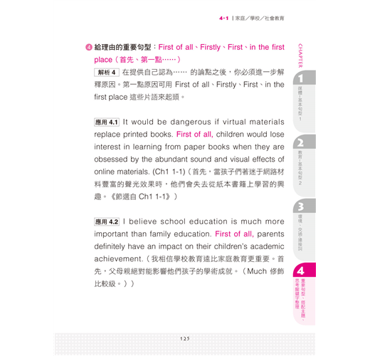 應用4.1:It would be dangerous if virtual materials replace printed books. First of all, children would lose interests in learning from paper books when they are obsessed by the abundant sound and visual effects of online materials. (Ch1 1-1)(首先,當孩子們著迷於網路材料豐富的聲光效果時,他們會失去從紙本書籍上學習的興趣。《節選自Ch1 1-1》)