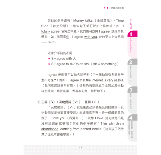 agree後面還可以加名詞子句(**一個動詞有多重身份並不奇怪**)例如:I agree that the Internet is very useful.(我同意網路非常有用。)這句的句型就成了主詞加及物動詞加受詞,也就是第二大基本句型,解析如下: