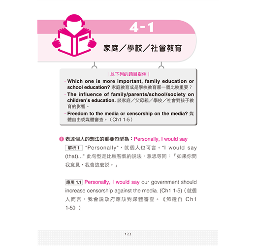 應用1.1:Personally, I would say our government should increase censorship against the media. (Ch1 1-5) (就個人而言,我會說政府應該對媒體審查。《節選自Ch1 1-5 》)