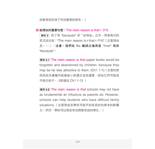 解析3:除了用“because”來「給理由」之外,想拿高分的英文說法有:“The main reason is + that + 子句”(主要理由是……)。注意:我們在be動詞之後是用“that”而非“because”。