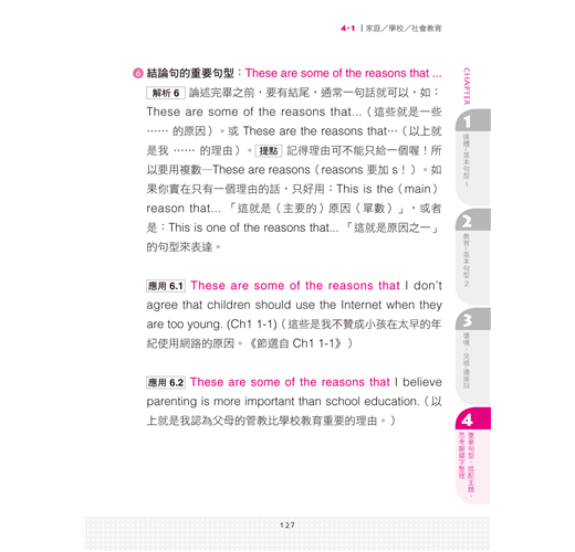 解析6:論述完畢之前,要有結尾,通常一句話就可以,如:These are some of the reasons that...(這些就是一些……的原因)。或These are some of the reasons that…(以上就是我……的理由)。提點:記得理由可不能只給一個喔!所以要用複數These are及reasons。如果你實在只有一個理由的話,只好用:This is the (main) reason that...「這就是(主要的)原因(單數)」,或者是:This is one of the reasons that...「這就是……的原因之一」的句型來表達。