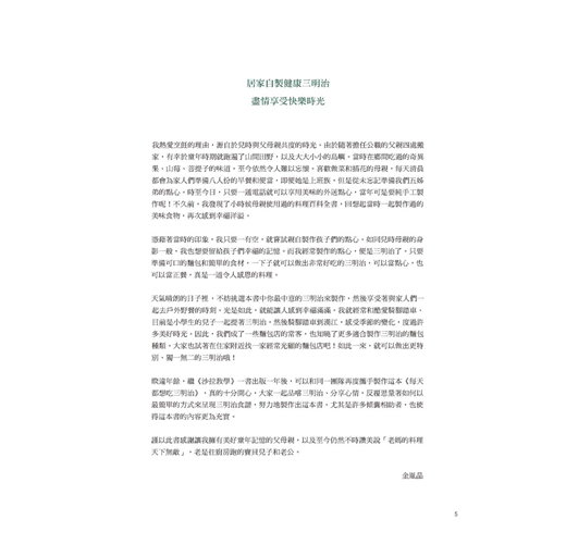 謹以此書感謝讓我擁有美好童年記憶的父母親,以及至今仍然不時讚美說「老媽的料理天下無敵」,老是往廚房跑的寶貝兒子和老公。