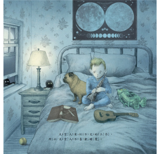 小克里斯是一位太空人──非常忙碌的太空人。對一位太空人而言,從外星人手裡拯救地球遠比洗澡或是睡覺更為重要,所以克里斯不喜歡睡覺。而且,當房間的燈光熄滅時, 那種黑暗會把最可怕的外星人吸引過來!但是,當克里斯看著人類第一次登陸月球的轉播時,他才發現,有一個比關上燈的房間更廣大、更深遠、更黑暗的空間。他意識到,在那裡蘊藏著未知的可能,等待著他去探索……