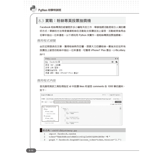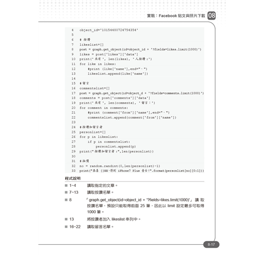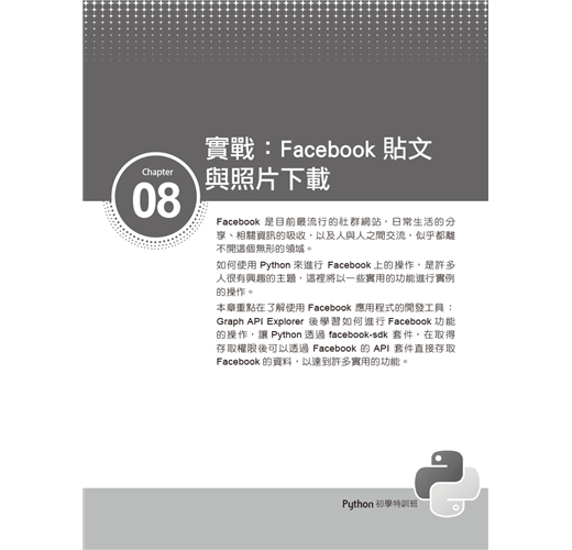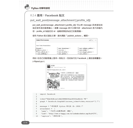 Facebook是目前最流行的社群網站,日常生活的分享、相關資訊的吸收,以及人與人之間交流,似乎都離不開這個無形的領域。如何使用Python來進行Facebook上的操作,是許多人很有興趣的主題,這裡將以一些實用的功能進行實例的操作。