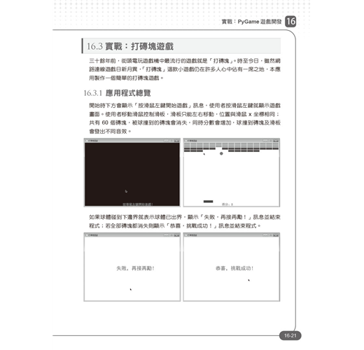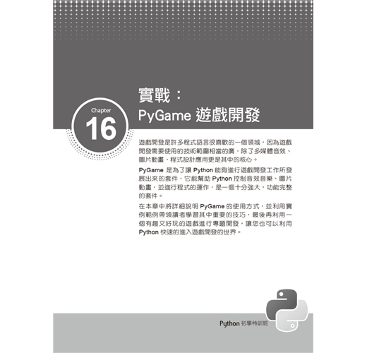 遊戲開發需要使用的技術範圍相當廣泛,除了多媒體音效、圖片動畫,程式設計應用更是其中的核心。PyGame是為了讓Python能夠進行遊戲開發工作所發展出來的套件,它能幫助Python控制音效音樂、圖片動畫,並進行程式的運作,是一個十分強大,功能完整的套件。