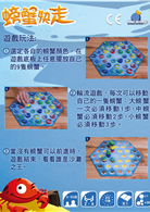 1.選定各自的螃蟹顏色,在遊戲底板上任意擺放自己的9隻螃蟹。