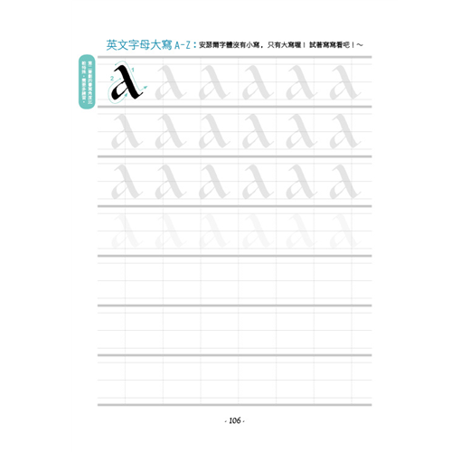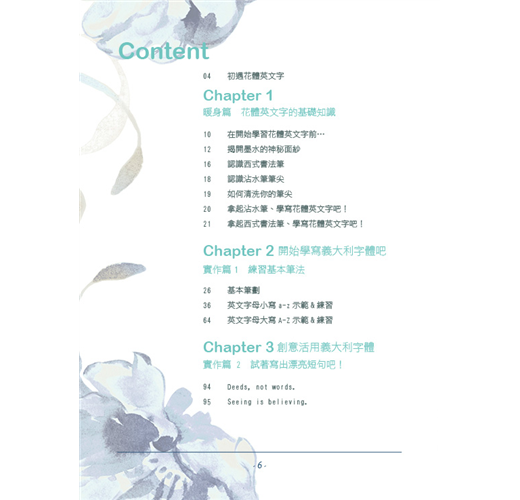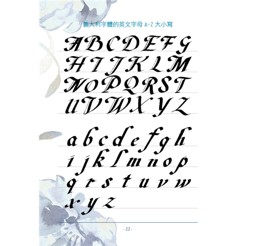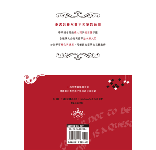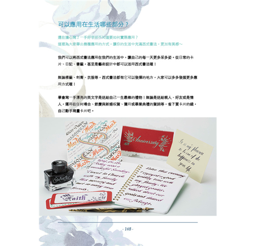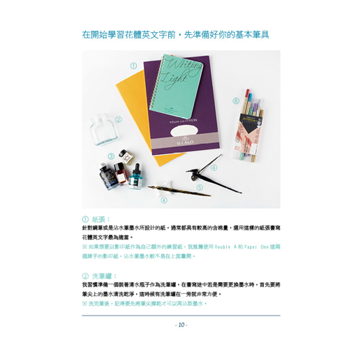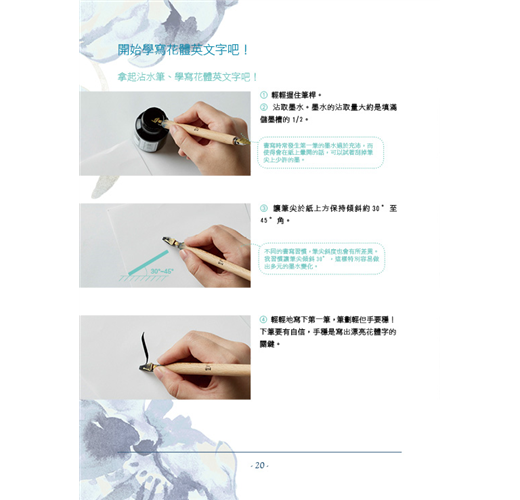 本書適用於所有各種樣式的水性平尖筆頭。跟著書中字帖的格線,把頁面拉至歪斜的45度角做練習,逐漸熟習手感。將簡單的ABC字母寫成令人驚艷的藝術字體!比起哥德字體與法式浪漫字體,義大利與安瑟爾兩種確實更容易上手。此外,書中除了介紹入門所需工具外,更會針對筆具及墨水的使用方法更加詳細說明,讓大家對花體英文字有更全面的認識。