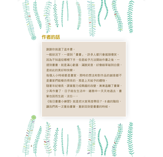 每個人小時候都是畫家,那時的想法和對作品的創意都不是畫家們能模仿得來的,那是上天給予的禮物。隨著年紀增長,課業壓力或興趣的改變,漸漸遠離了畫筆,少再作畫了,日子就在生活中、雜務中一天天地過去,畫筆也因而生疏、淡忘⋯。《每日畫畫小練習》就是把大家再度帶回7、8 歲的階段,讓我們再一次重拾畫筆,重新回到愛畫畫的時候。