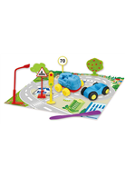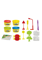 4色黏土(綠色、紅色、藍色、黃色)、11款黏土工具(4個交通號誌、2個路樹、1把工具刀、2個汽車模具、1個汽車底座、1張小鎮交通圖)