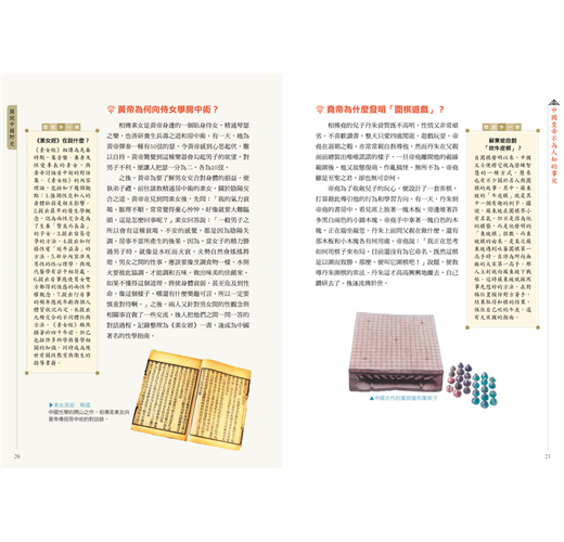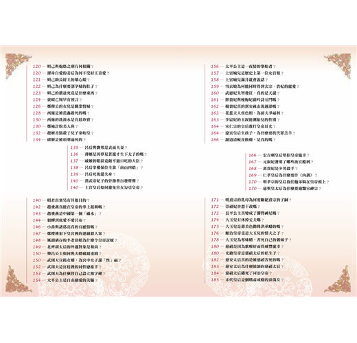 在「宮闈裡,那些不能說的祕密」裡,則揭祕帝王后妃的宮闈內幕,比方關於始皇帝其他子女的下落?玄武門之變的真相等等。