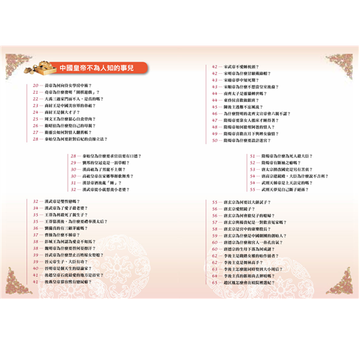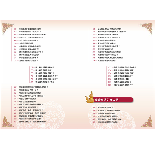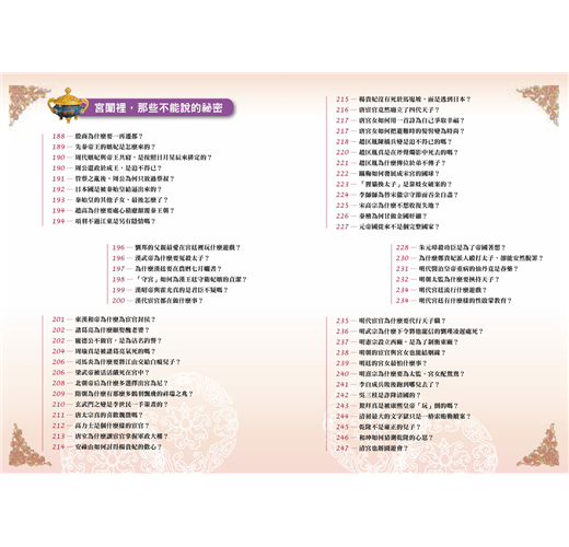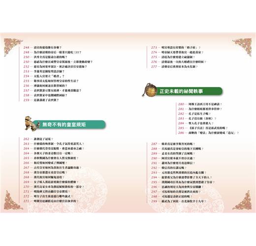在「無奇不有的皇室規矩」裡,更是帶您大開眼界,詳細介紹了宮闈制度典故,生動再現歷朝歷代的風情百態,如什麼朝代登堂沒脫鞋,會惹來殺身之禍?康熙為什麼要建立祕儲制等。