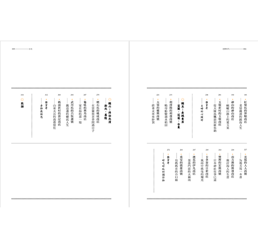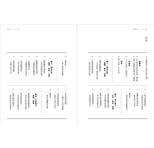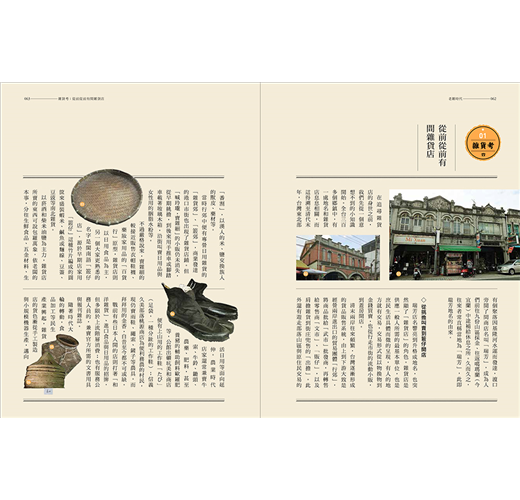 【雜貨考】:〈從前從前有間雜貨店〉、〈巷口熟悉的菸酒牌〉、〈柴米油鹽鎮店之寶〉、〈主婦的心頭好〉、〈好吃好玩的囡仔物〉、〈老物最相思〉