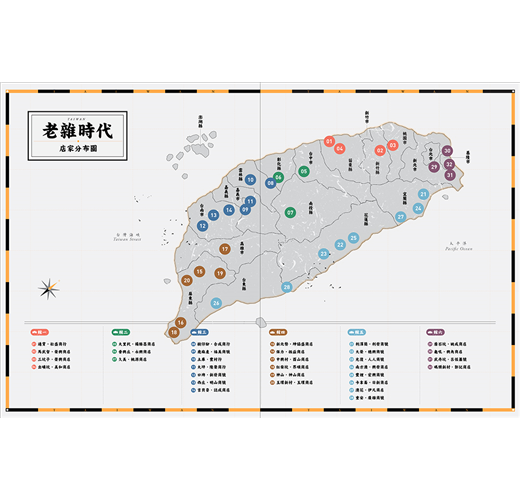 攤開這幅地圖,依據島嶼的東南西北中,以及靠山、臨海、農村、市街、部落、眷村的差異,我們所記述到的在地產業也大不同,傳統的茶業、礦業、菸業、漁業等都在老闆口中鮮活起來。比如石碇磨石坑的老闆世代種茶,對製茶的專精不亞於開店做生意;雙溪牡丹的老闆年輕時在瑞芳燒焦炭、侯硐挖煤礦,會爽朗聊起和外省礦工交遊的回憶。