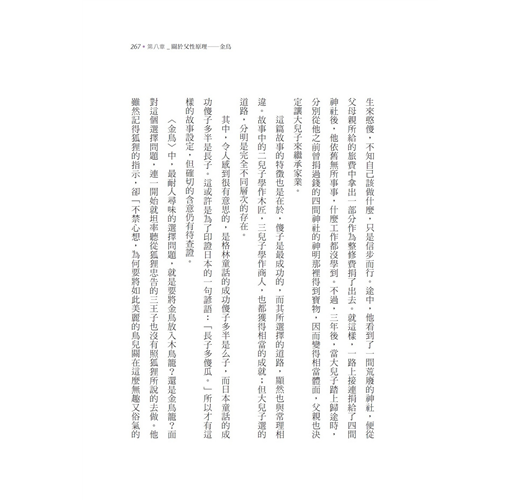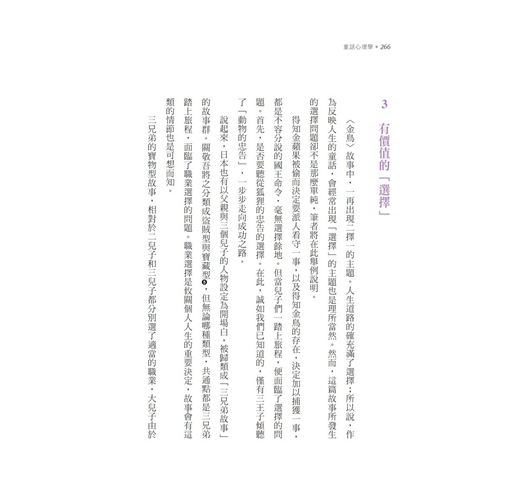 再者,當今的時代,對於起自家庭關係,終至自己人生的想法及接納方式,都有極大的障礙。本書透過童話來思考人的生存方式,並在某程度上,依序顯示了自我實現(self-actualization)的過程;因此,在跳脫童話來思考自己人生這方面也極具意義。