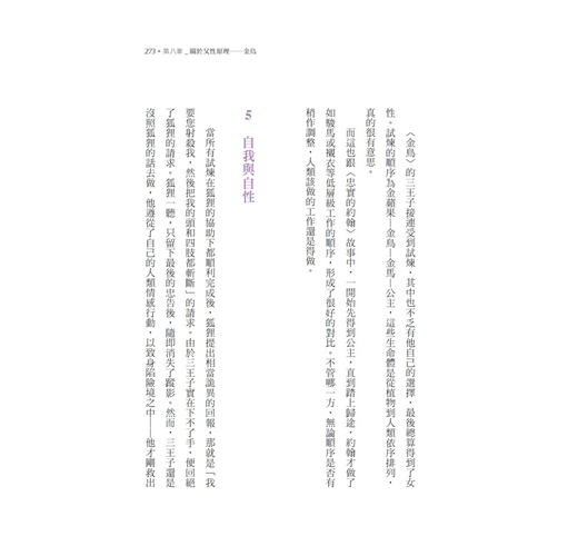 本書在某程度上,依序顯示了自我實現(self-actualization)的過程,並透過童話思考人的生存方式,提引出就連你自己也從未見過的「自己」。
