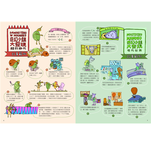你也可以鎖定一個人物,一頁頁翻書,看看他在做什麼,這就是他的故事。你可以把這個故事說給別人聽,或者把它寫下來。看完一個人物的故事,就再換另一個人物從頭看。這麼算起來,一本書裡就包含了幾十個故事呢!